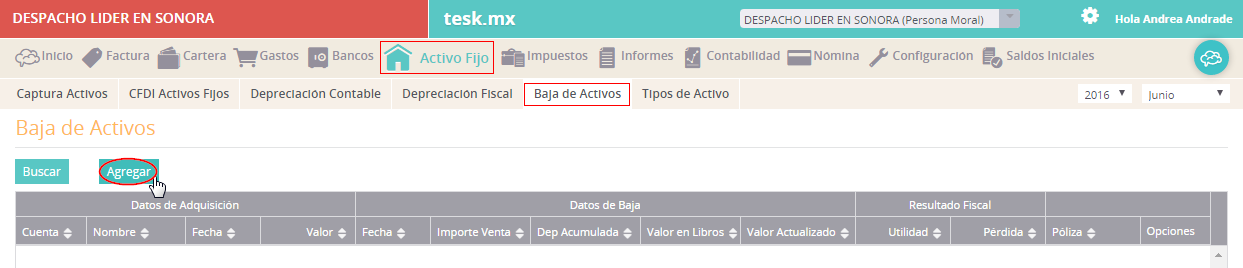 2. Oprime el botón Agregar y se abrirá un formulario donde deberás especificar el Activo, y la causa de la baja: en este caso Baja, así como la Fecha de registro de la póliza, y la Fecha de baja. El resto de los datos, el sistema los llenará, por lo que solo falta Seleccionar el botón Guardar y haz terminado.