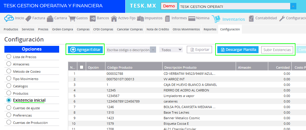 - Podemos realizar otras cargas de Existencias iniciales de productos nuevos o diferentes a los ya subidos.