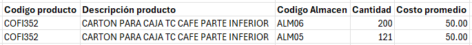 -Para el llenado de la columna Código Almacén se muestra la ayuda en las columnas J y K del mismo archivo. Cuando se tiene un producto en mas de un almacen, entonces debera usar dos renglones, uno por cada almacen, ejemplo: