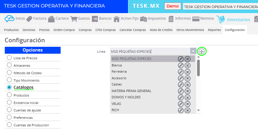 2. De clic en la opción Catálogos, en el campo "Linea" se encuentra creada una linea con el nombre: "General"