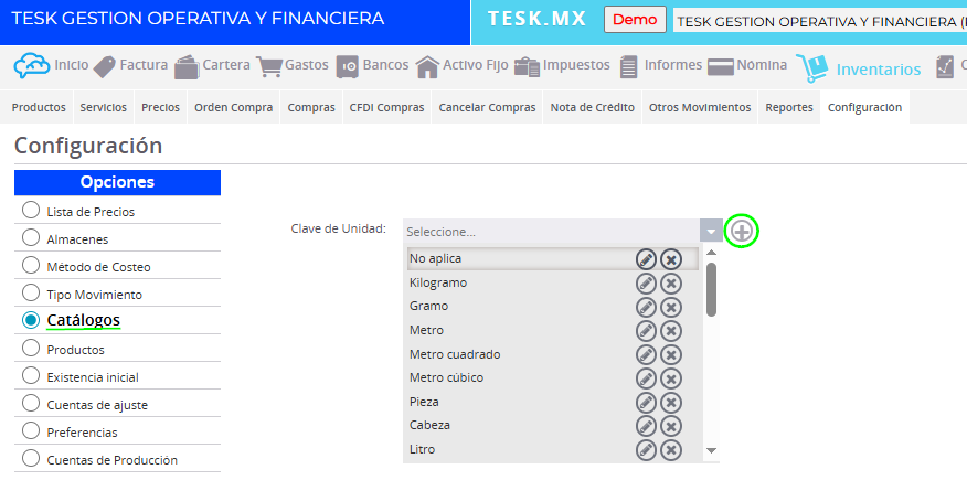 1. Encuentra esta opción en modulo Inventarios, menú Configuración, Opción "Catálogos".