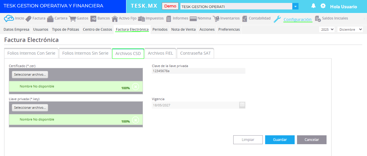 1. Vaya al módulo Configuración, menú Factura Electrónica, pestaña Archivos CSD
