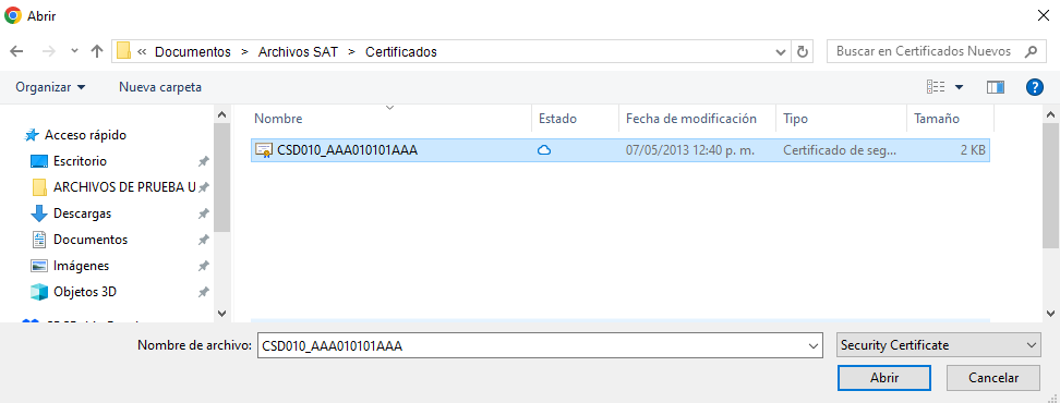 2. De un clic sobre el botón seleccionar archivo del Certificado (*.cer)