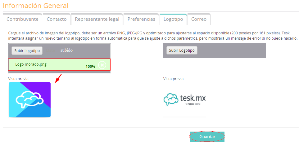 (200 pixeles por 161 pixeles). Tesk intentará asignar un nuevo tamaño al logotipo en forma automática para que se ajuste
