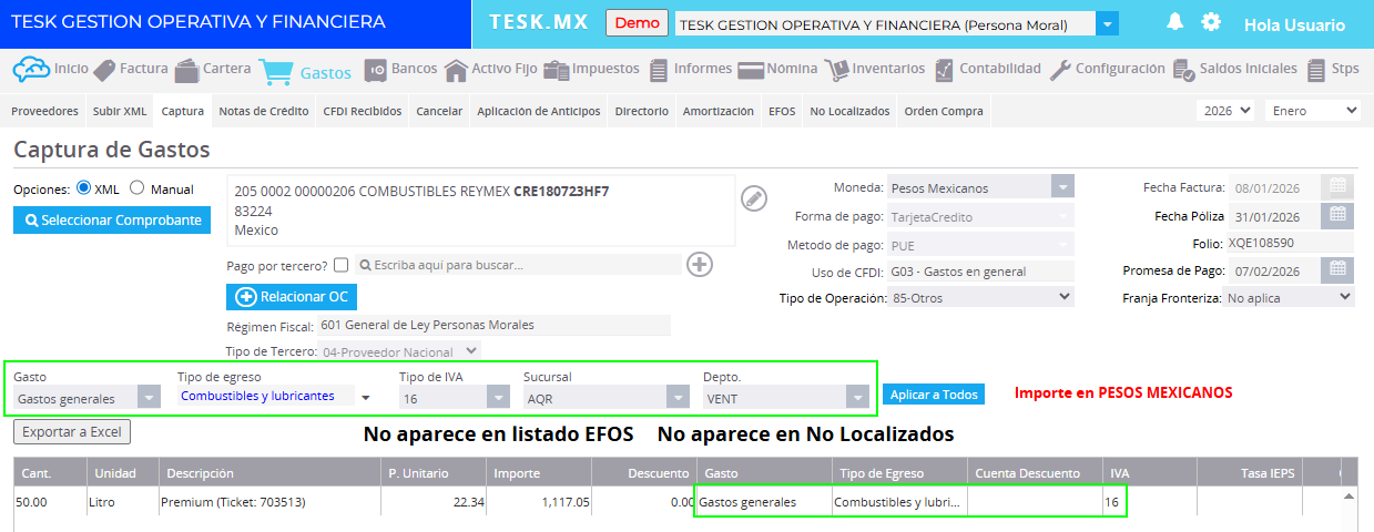 Ingrese al módulo Gastos, menú Captura, y seleccione el comprobante correspondiente.