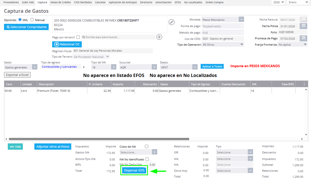Anteriormente, en estos casos era necesario dispersar manualmente un concepto de la factura, separando la parte que incluye IEPS de la que no lo incluye, para poder registrar correctamente el gasto.